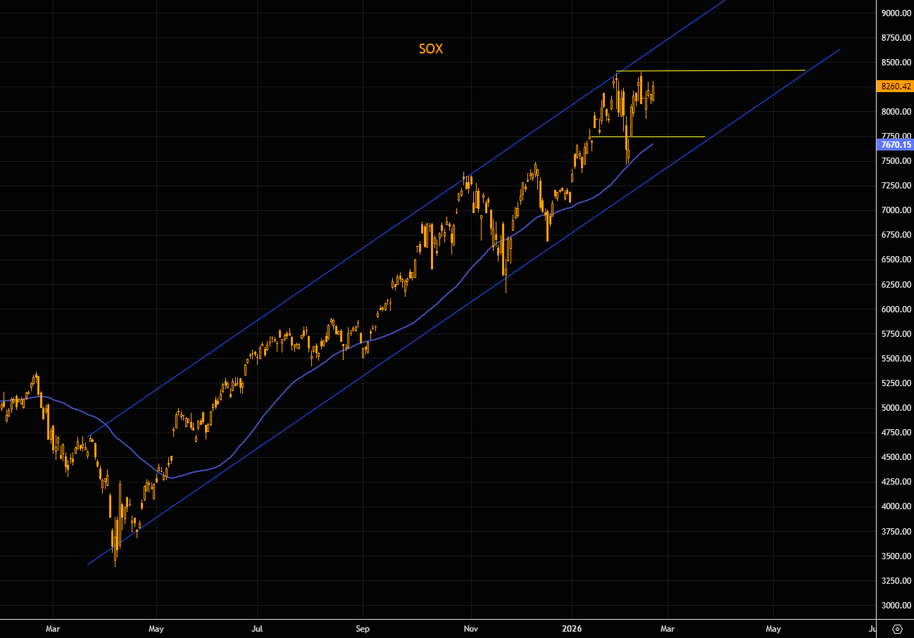 SOX still very much inside the great trend channel. Note the index has been consolidating over the past weeks. First bigger support comes in right around the 50 day MA.