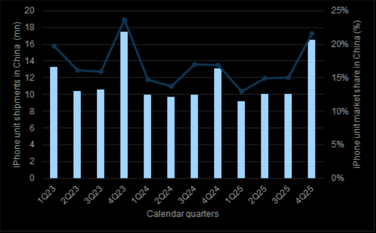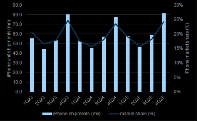 IDC estimates C4Q25 iPhone unit shipments grew 5% YoY to 81.3 mn, representing 25% of overall market shipments.