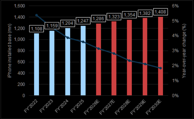 GS: "We believe that the active iPhone installed base will approach ~1.3 bn in F2026 as first smartphone and switchers continue to more than offset churn."