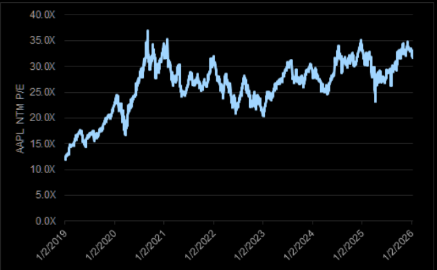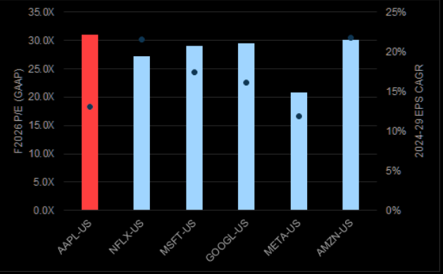 APPL trades in line with select large cap tech peers.