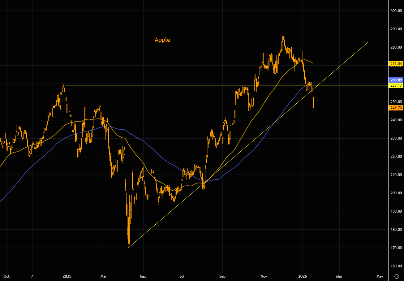 Apple started losing the anti AI outperformance touch late last year. The stock has now crashed through some major support. We are well below the 50 day (now negatively sloping) and also below the 100 day here.