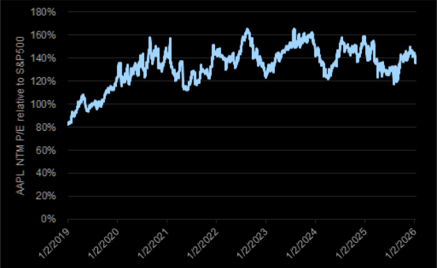 AAPL trades at ~31X NTM P/E v. 2020-25 average of ~28x (chart 1). On a relative basis, AAPL trades at ~136% the S&P 500 NTM P/E, just below its 2020-25 average of 139% (chart 2).