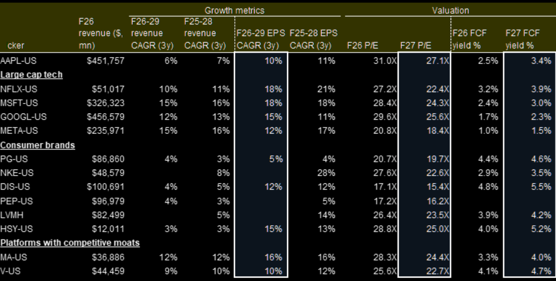 AAPL v. select comps in large cap tech, consumer brands, and payments.