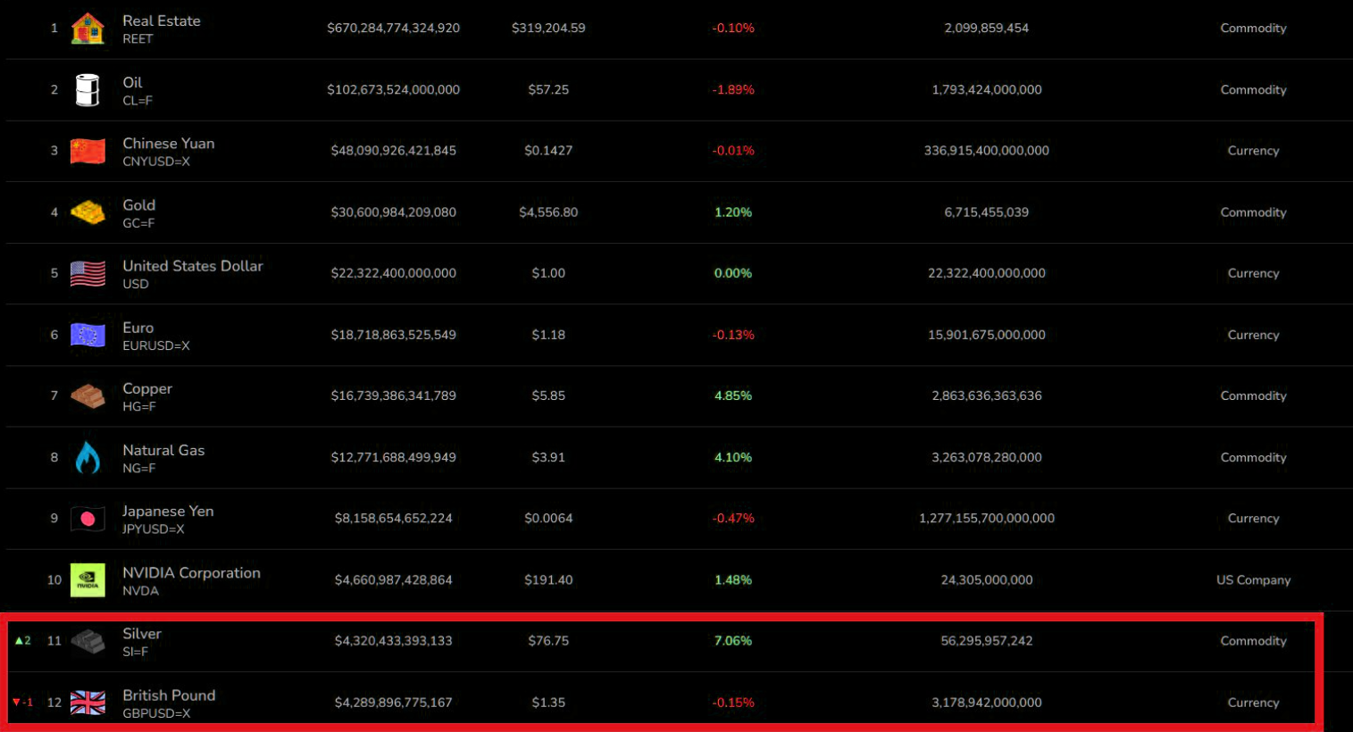 Silver overtakes the British Pound as the World's 11th most valuable asset. Data from @AssetMarketCap - not exactly sure how they calculate all this market caps (futures & physical?)