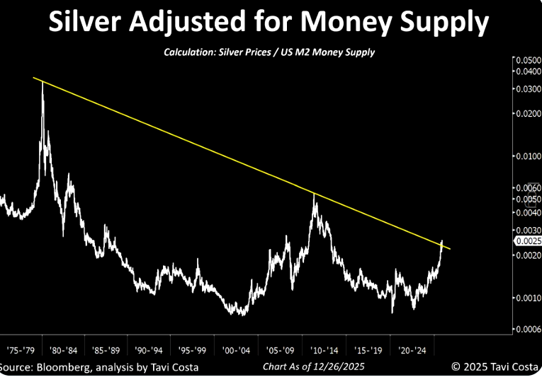 "Keep in mind that silver adjusted for money supply is only now breaking out from more than 45 years of resistance." (Octavio Costa)