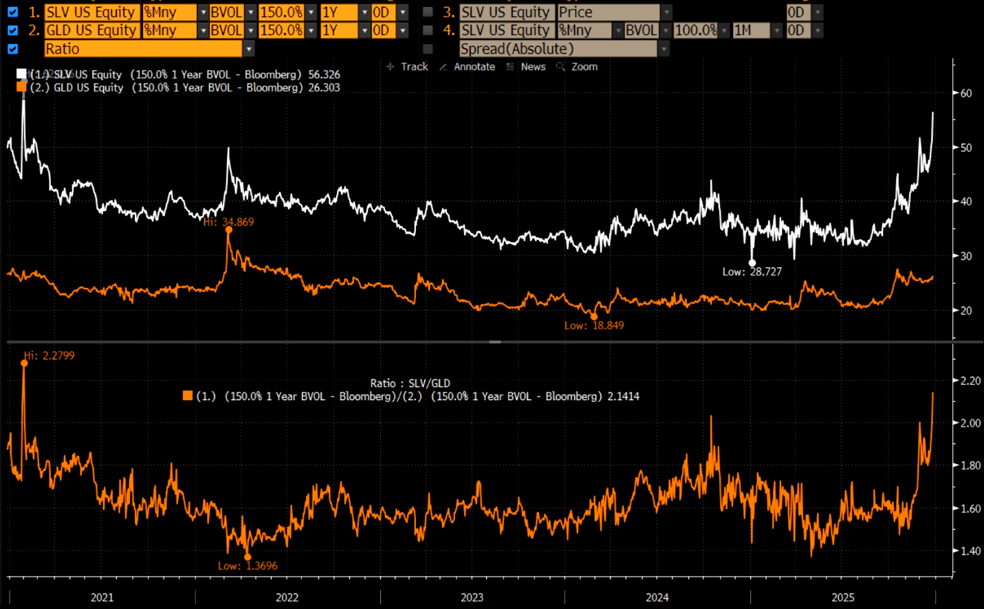 "The ratio of silver to gold vol is essentially at an ATH. Currently, one year 50% OTM calls on the $SLV carry an implied vol of 56. That's more than double the same strike vol in $GLD... chart below."
