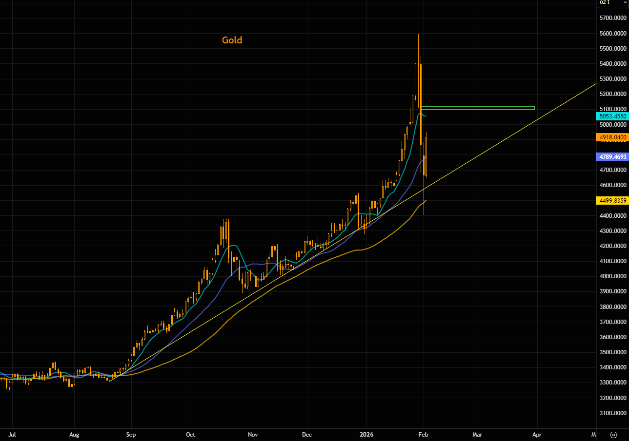 Gold briefly traded below both the 50-day MA and the rising trend line during the latest bout of chaos. The rebound has pushed price back above the 21-day MA. Initial resistance sits near $5,100, roughly the 50% retracement of the large down candle (excluding the shadow), with the 8-day MA just below. Latest on precious metals here.