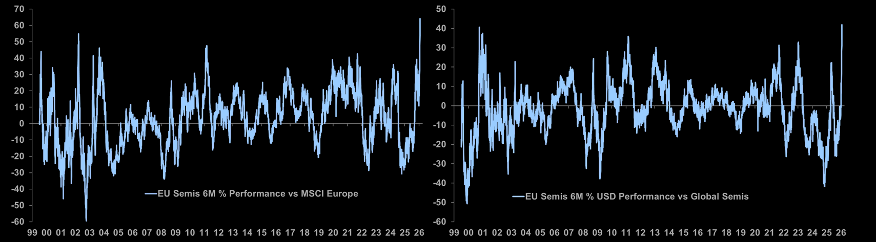 EU semis have just enjoyed their best-ever 6M outperformance vs both i) the EU market and ii) global semis…Latest note on Europe here.
