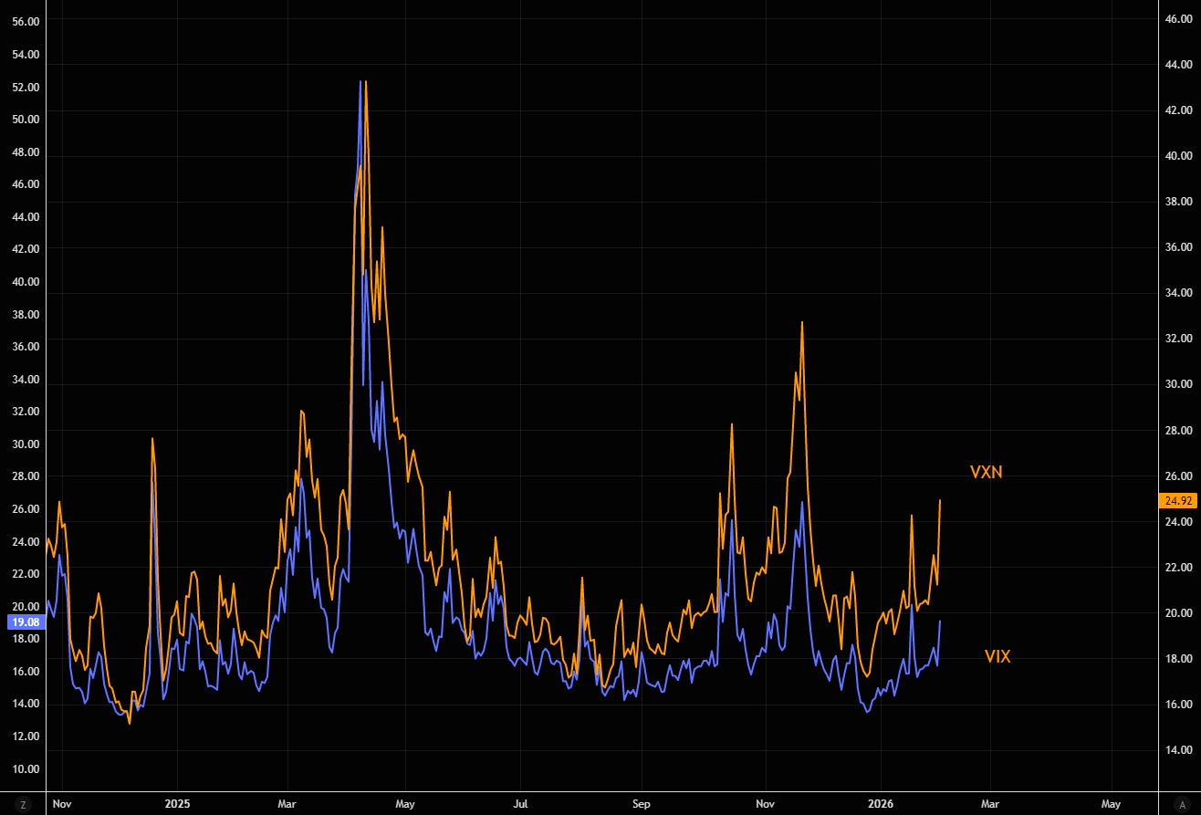 VXN at the highest levels since late November. Note that VXN has "outperformed" the VIX lately.