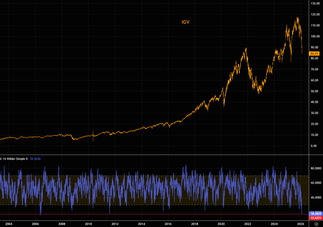 IGV at the most oversold levels since "forever" basically (RSI 18!). More on this theme and downside convexity in markets here and here.