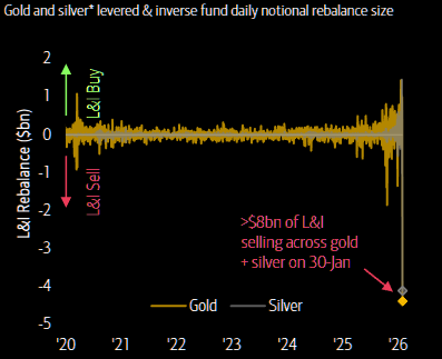 "On Friday 30-Jan, L&I (leveraged and inverse) funds sold >$8bn across gold + silver (~$4bn each) in response to historic pullbacks in those assets".