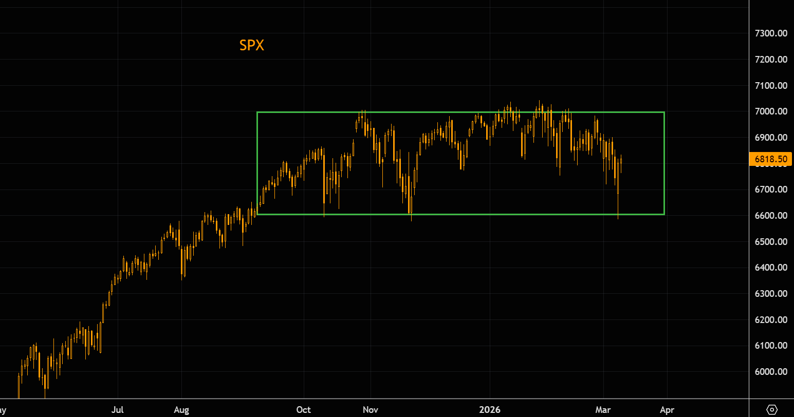 SPX remains stuck inside the range that has been in place since last autumn. Impressive given the many narratives and developments since then. The index is currently trading in the middle of the range, leaving very little edge trading it here according to us.