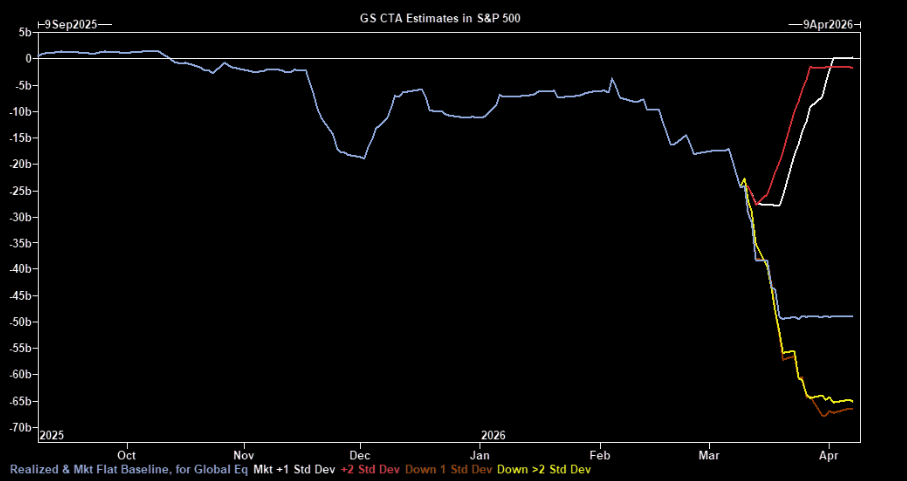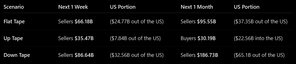 CTAs screen as sellers of equities across all scenarios over the next week and month according to GS. Estimated selling over the coming week is among the largest they have seen. Key SPX levels to watch: Short term 6894 // Medium term 6763 // Long term 6364.