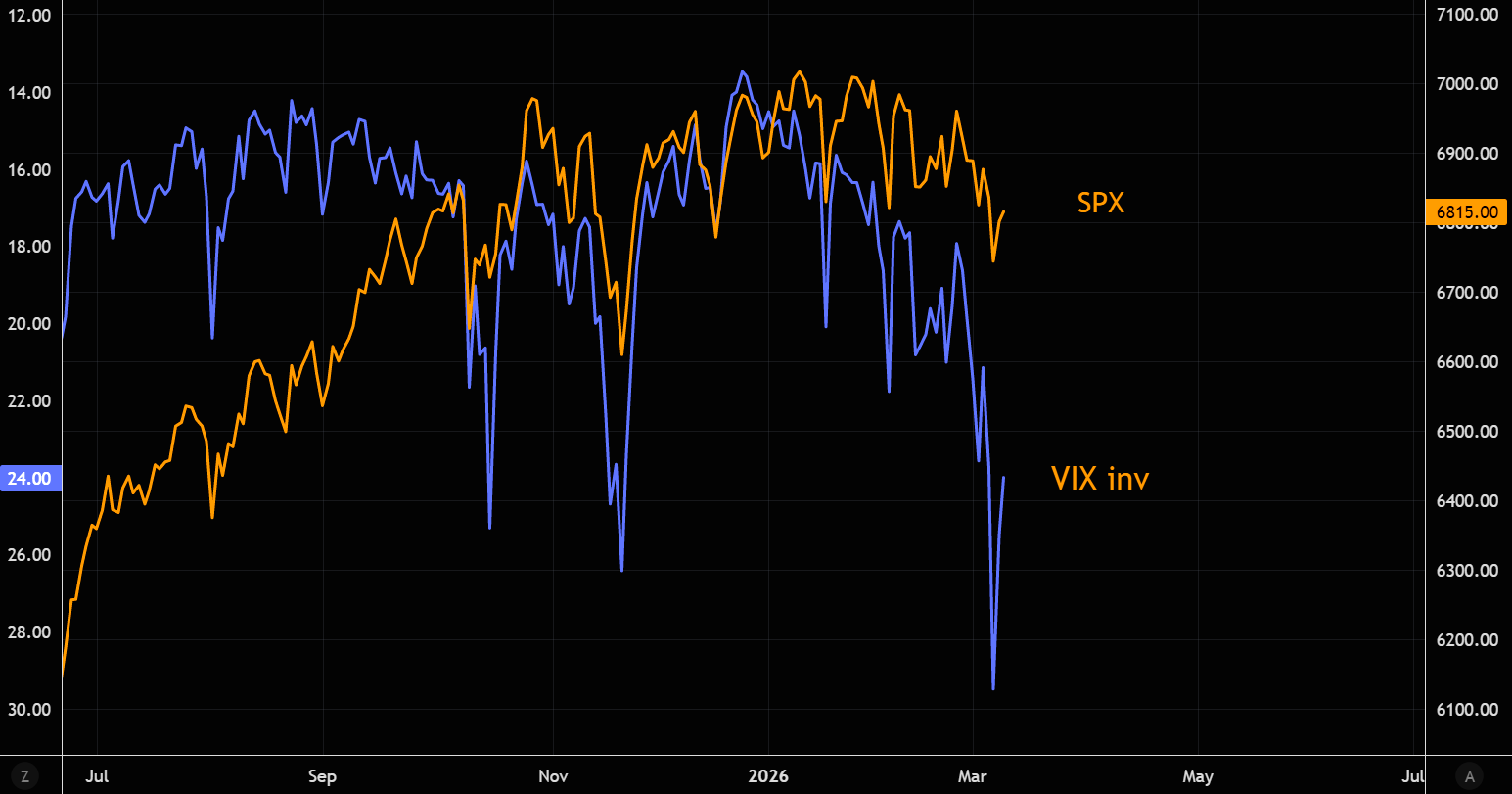 The VIX stress needs more time to work through the system. Chart shows SPX vs. VIX (inverted).