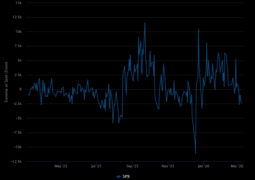 Dealers have entered short gamma land. All moves will be exaggerated as dealers now sell low, buy high.