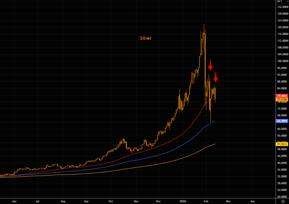 Massive moves in silver continue. As we write, price is cracking below the 50-day, printing one of the largest down candles in months.