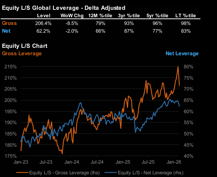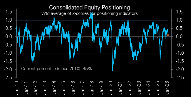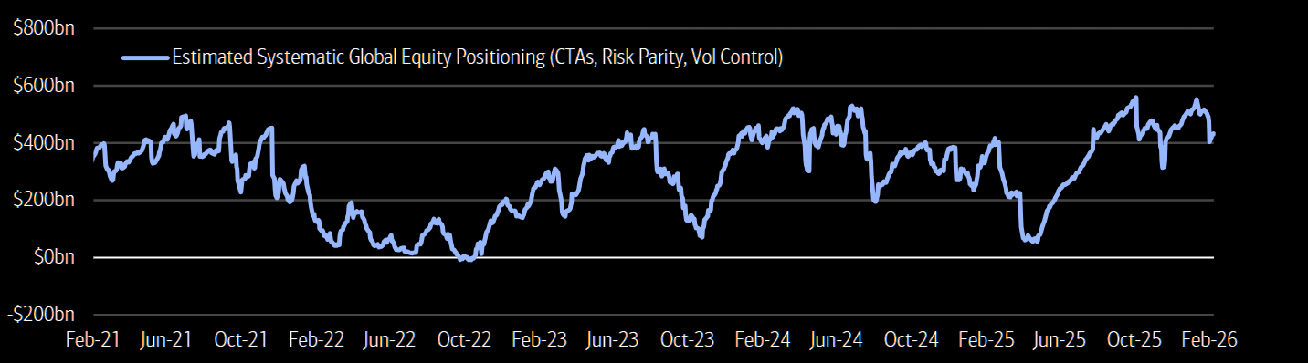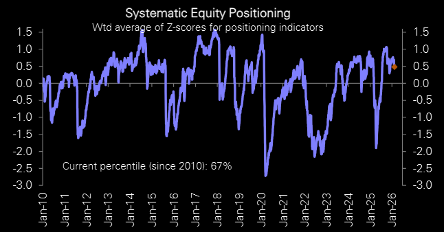 Systematic global equity positioning across CTAs, risk parity, and volatility control remains elevated relative to the last five years.