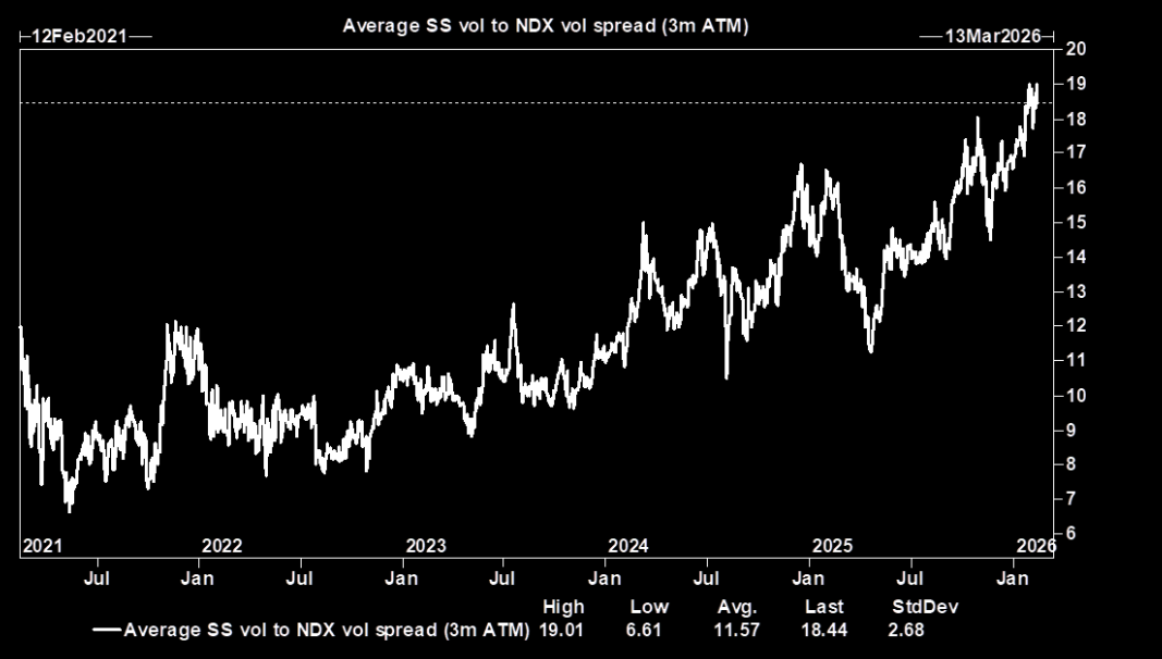 GS: "The moves under the surface don’t appear to be relaxing anytime soon. The average implied SS vol to index vol spread (3m ATM) continues to widen out. In other words, the market is expecting the dispersion to continue."