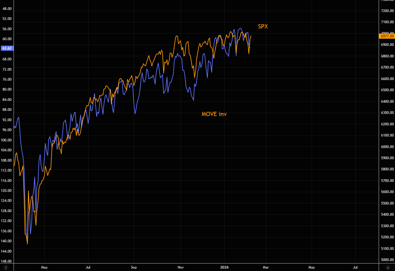 SPX and MOVE (inverted) have traded in perfect tandem since "forever". Let's see how this plays out, but the last little uptick in MOVE should be watched closely.