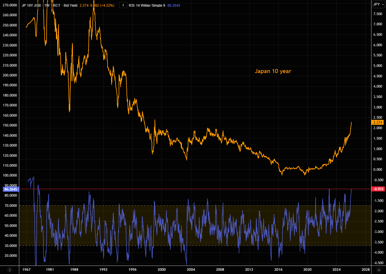 Japan’s 10-year weekly RSI is above 86, the most overbought since most people reading this were born.