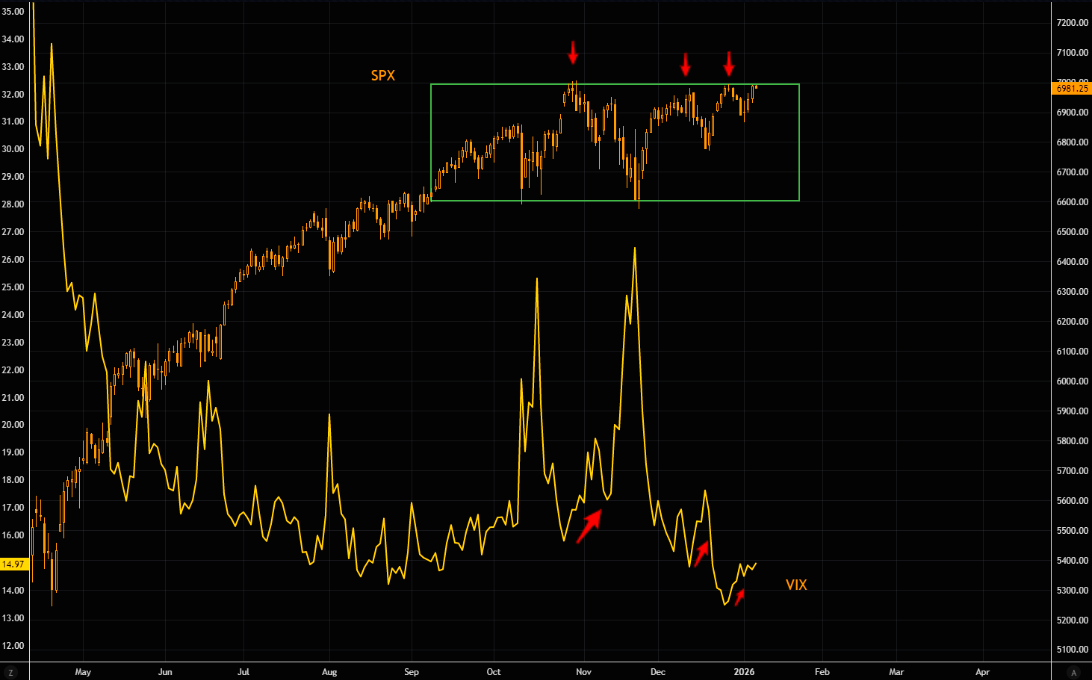 What if SPX rolls over at range highs again? In prior reversals, VIX moved sharply higher. With sentiment still bullish and limited downside left in VIX (a natural floor sits only slightly lower), using VIX for portfolio protection here makes sense. Waiting for “Christmas VIX lows” risks being too stingy.