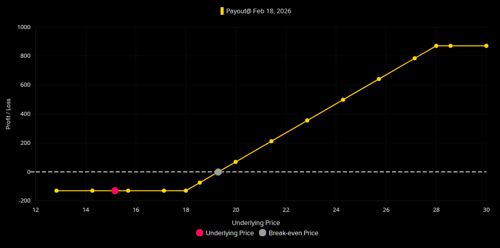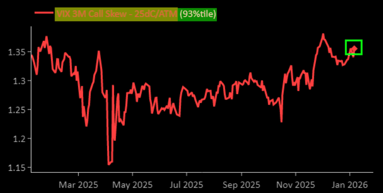 Well bid upside in VIX calls offers relatively attractive VIX call spreads. Chart 2 shows the VIX Feb 18/28 call spread, around 8x.