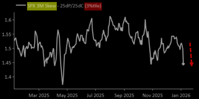 Skew is dead. Downside protection via the skew lens is starting to look attractive again, now trading in the 3rd percentile.