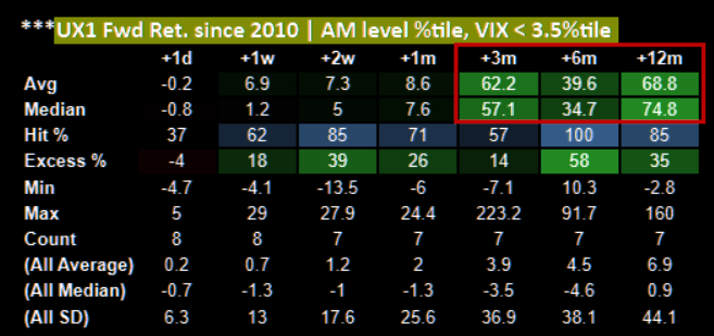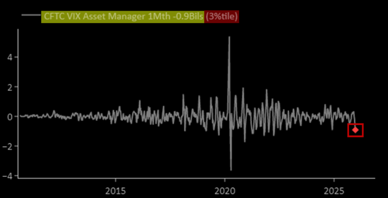 A backtest of Asset Manager VIX futures positioning shows that when the 1-month change sits at similarly extreme low percentiles, and is net short, outcomes have historically been ugly. Across the prior seven instances, forward 3-, 6-, and 12-month average and median returns all point to materially higher VIX.
