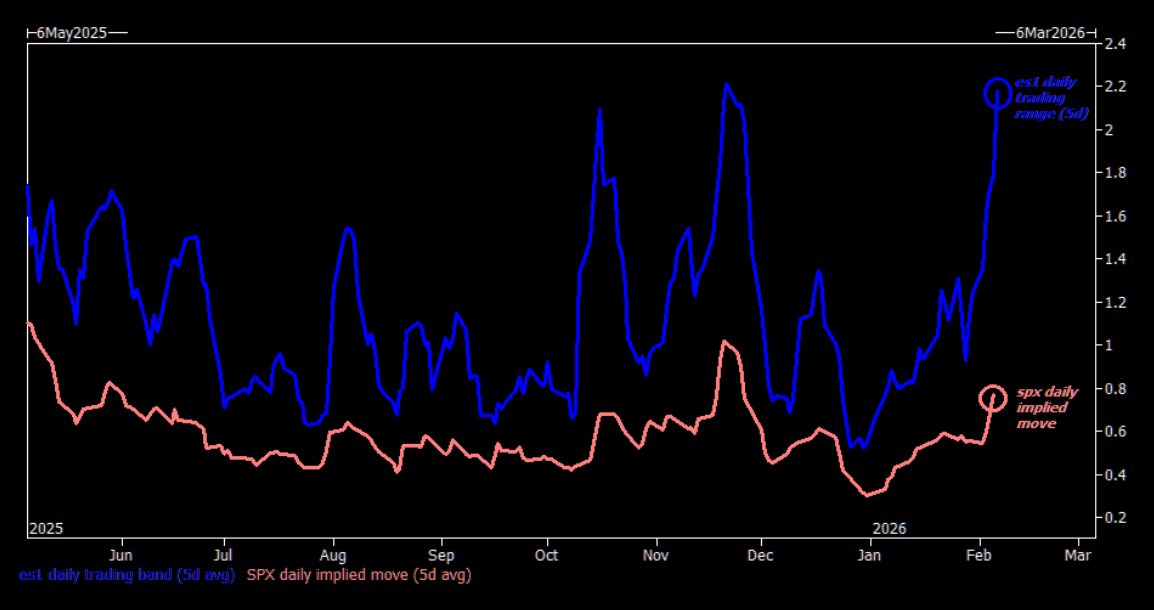 Gamma is “cheap” given that the SPX implied straddle trades ~80 basis points vs the daily trading band at 220 basis points. (GS)
