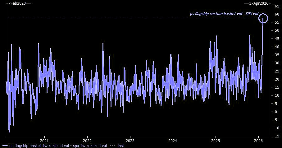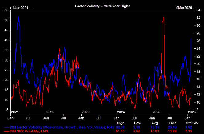 The change wasn’t price, it was the violence underneath. 20-day factor volatility has exploded to the highest level since 2021, signaling a fast, disorderly unwind of leadership. This is what active de-positioning looks like. Single-stock stress was real. (GS, Coppersmith)