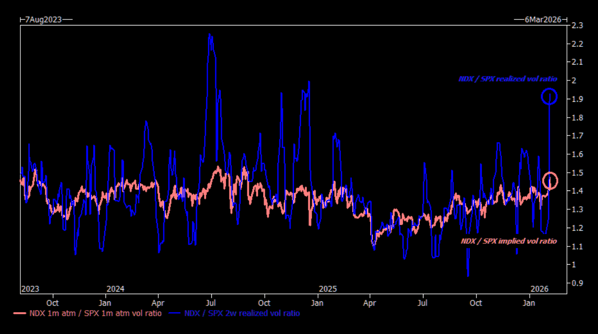 As we pointed out last week, this is mostly a tech thing. NDX vs SPX volatility has exploded to the upside.