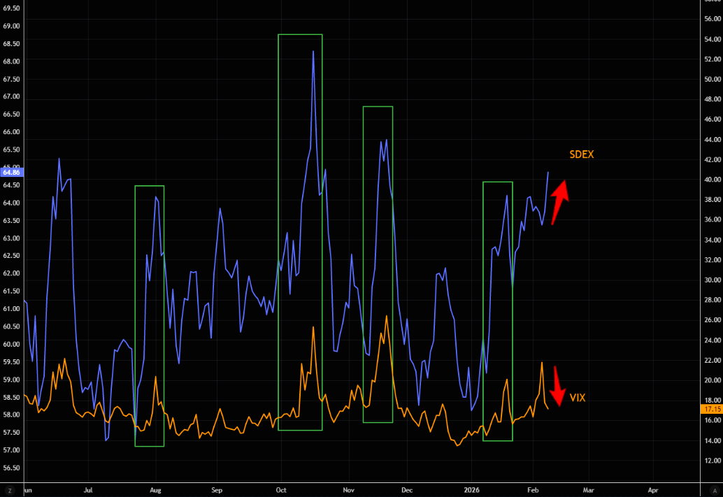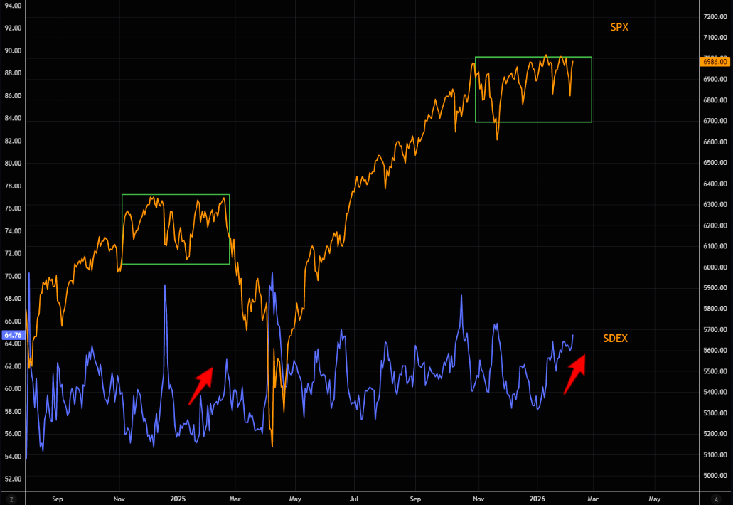 SPX remains stuck inside the range that’s held for months, while skew continues to get aggressively bid. The SDEX index has had an impressive run so far this year and is now printing fresh recent highs. Rising skew is a clear signal of a crowded long, with investors increasingly paying up for downside protection.