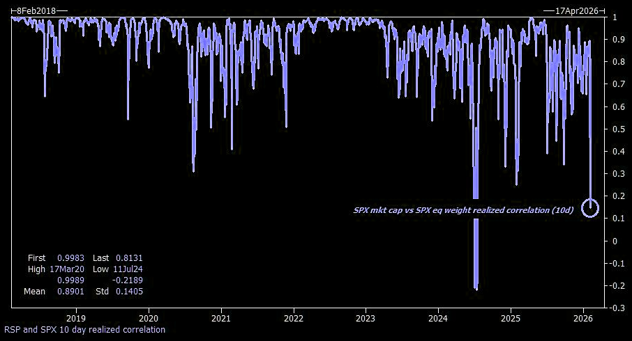 "...the correlation between SPX and RSP collapsed over the last two weeks, at the lows the two had almost 0.0 correlation with each other … recall, these indices have the exact same constituents..."(GS derivs)
