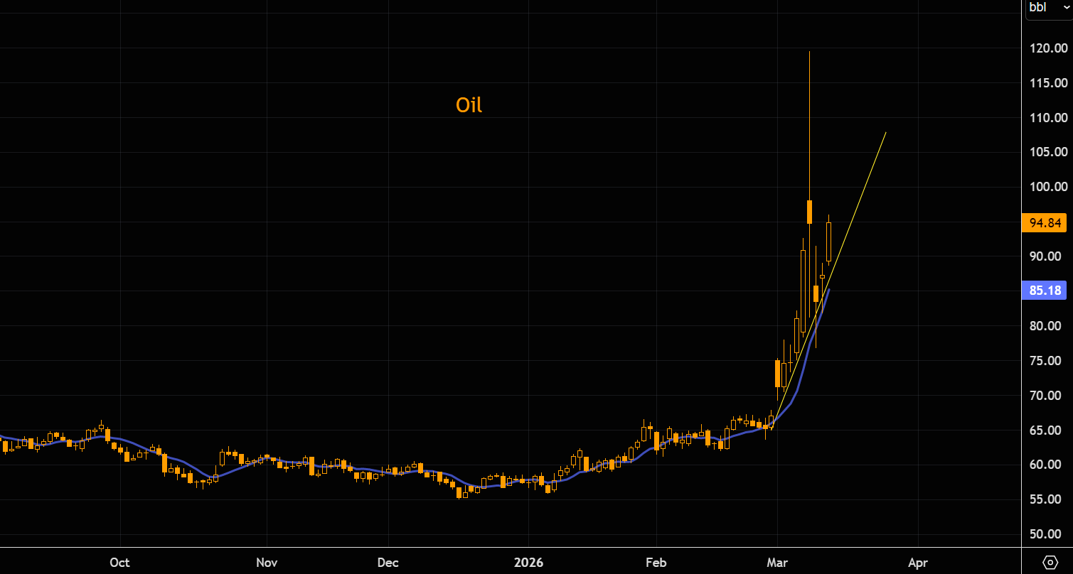 DB sums it up well: the more sustained the rise in oil prices, the more likely it is to produce lasting economic and societal consequences. For now, markets are still pricing a relatively short-lived spike. Brent crude is around $96/bbl, while the 12-month future sits closer to $74/bbl, suggesting investors expect prices to fall once the conflict eases. That means markets are not anticipating a prolonged shock like in 2022, when oil stayed above $100 for several months, or the 1970s crises when elevated prices lasted for years.