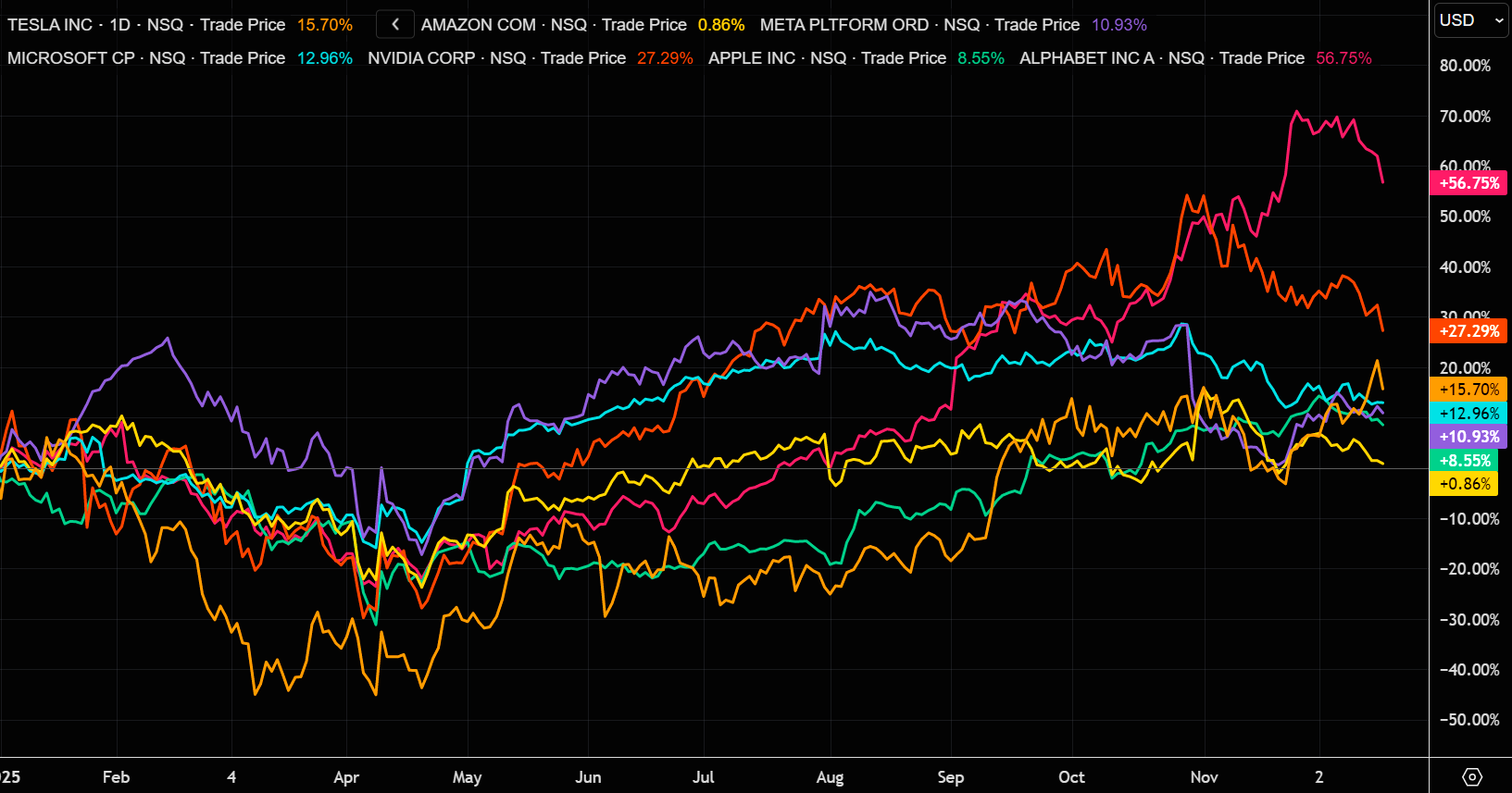YTD performance, from the top: GOOG, NVDA, TSLA, MSFT, META, AAPL, AMZN.