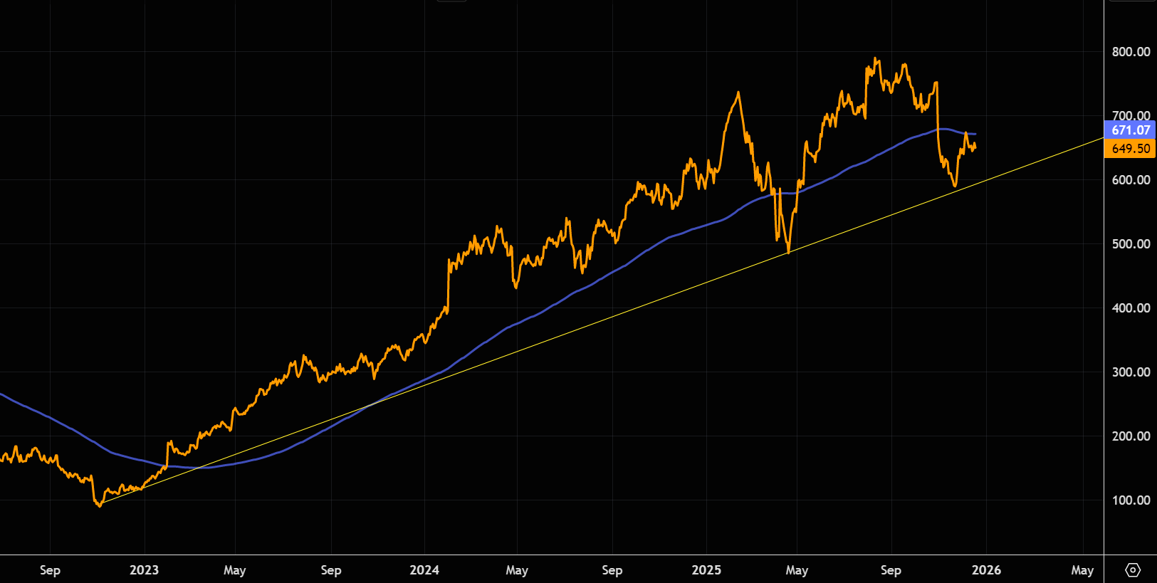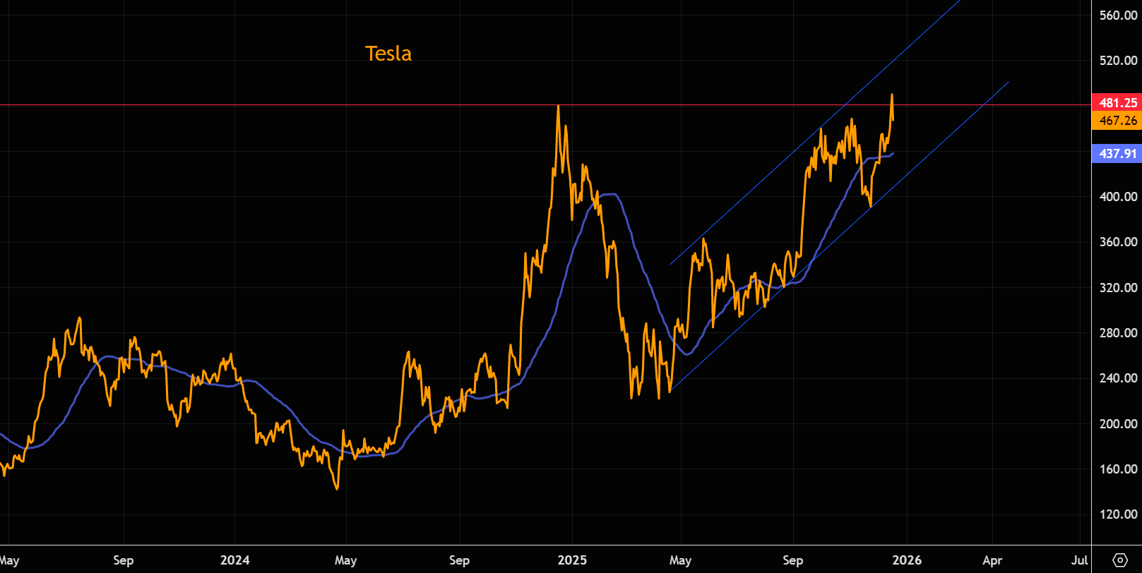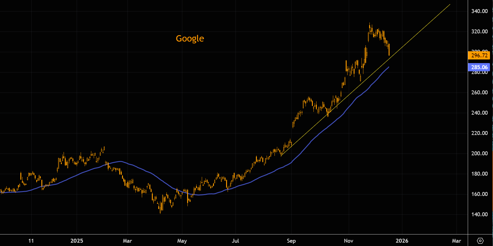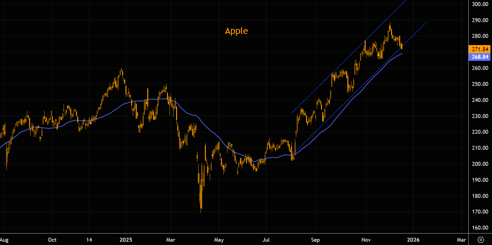 The anti AI trade has performed very well over the past months. Apple has traded inside the pretty much perfect trend channel. Note the 50 day coming in slightly lower.