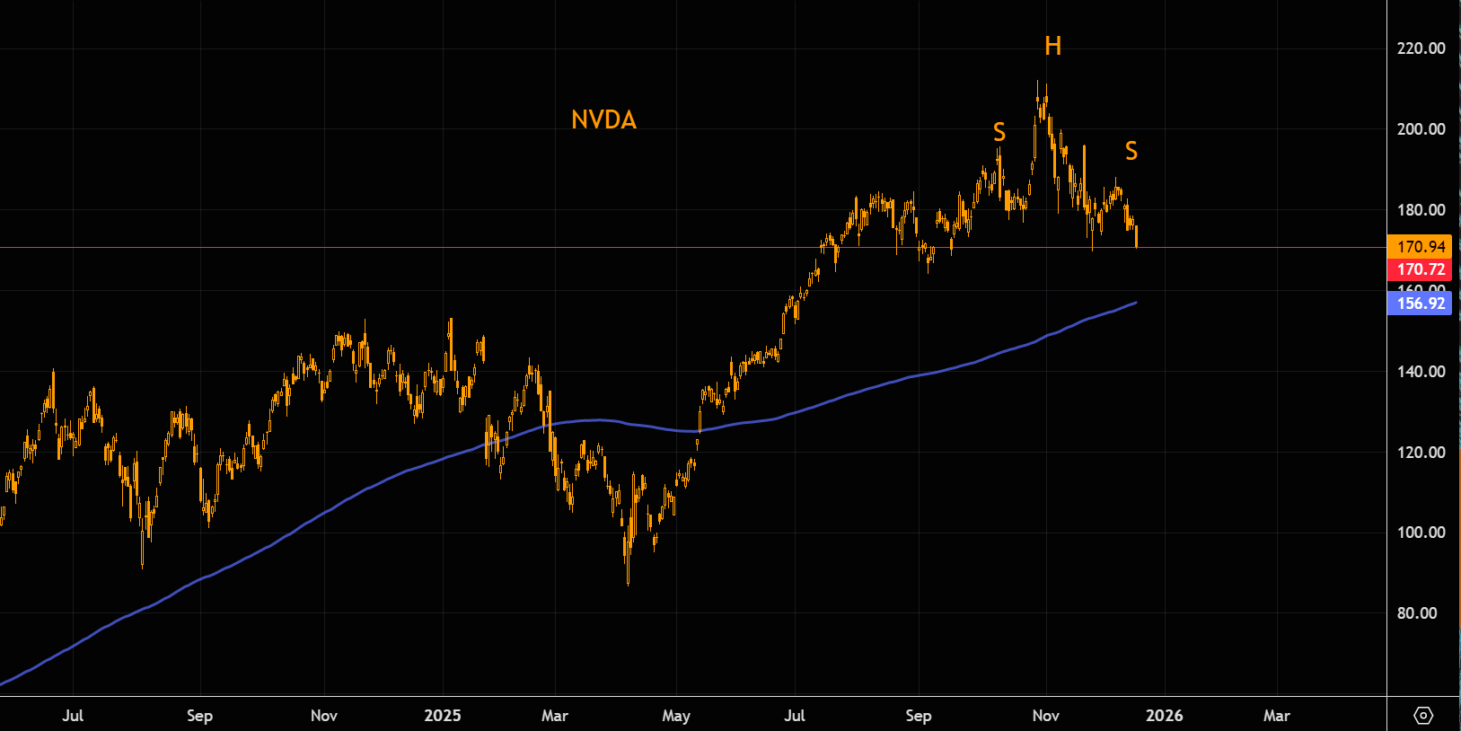 The world's hottest stock is trading at July levels, i.e very little trend over the past months. $170 is huge. A break below and the HS formation could come into play.