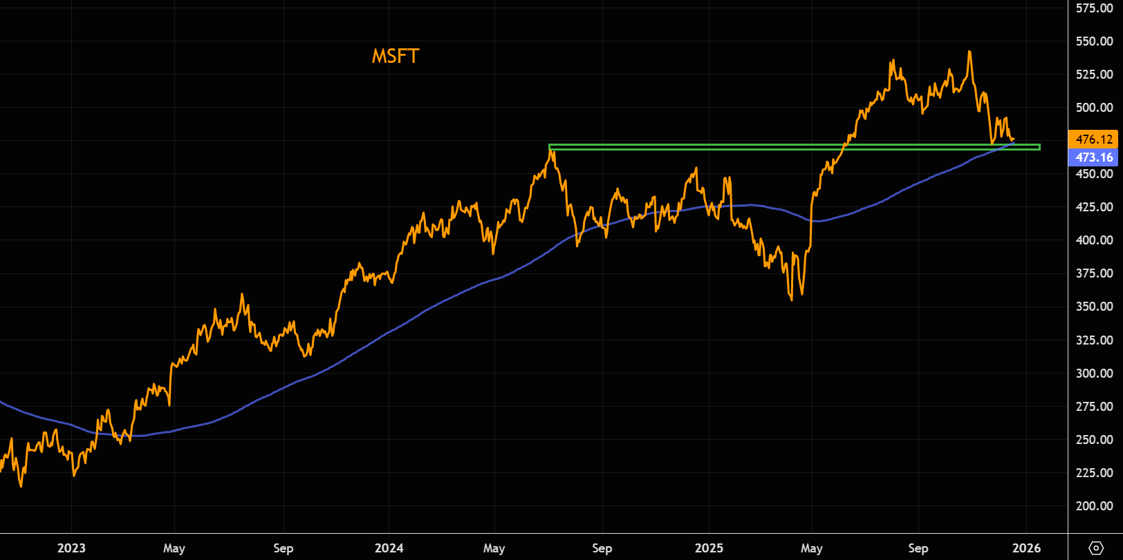 MSFT is down to the 200 day support, but this remains a dull name. We are trading at the same levels we traded at in July 2024...