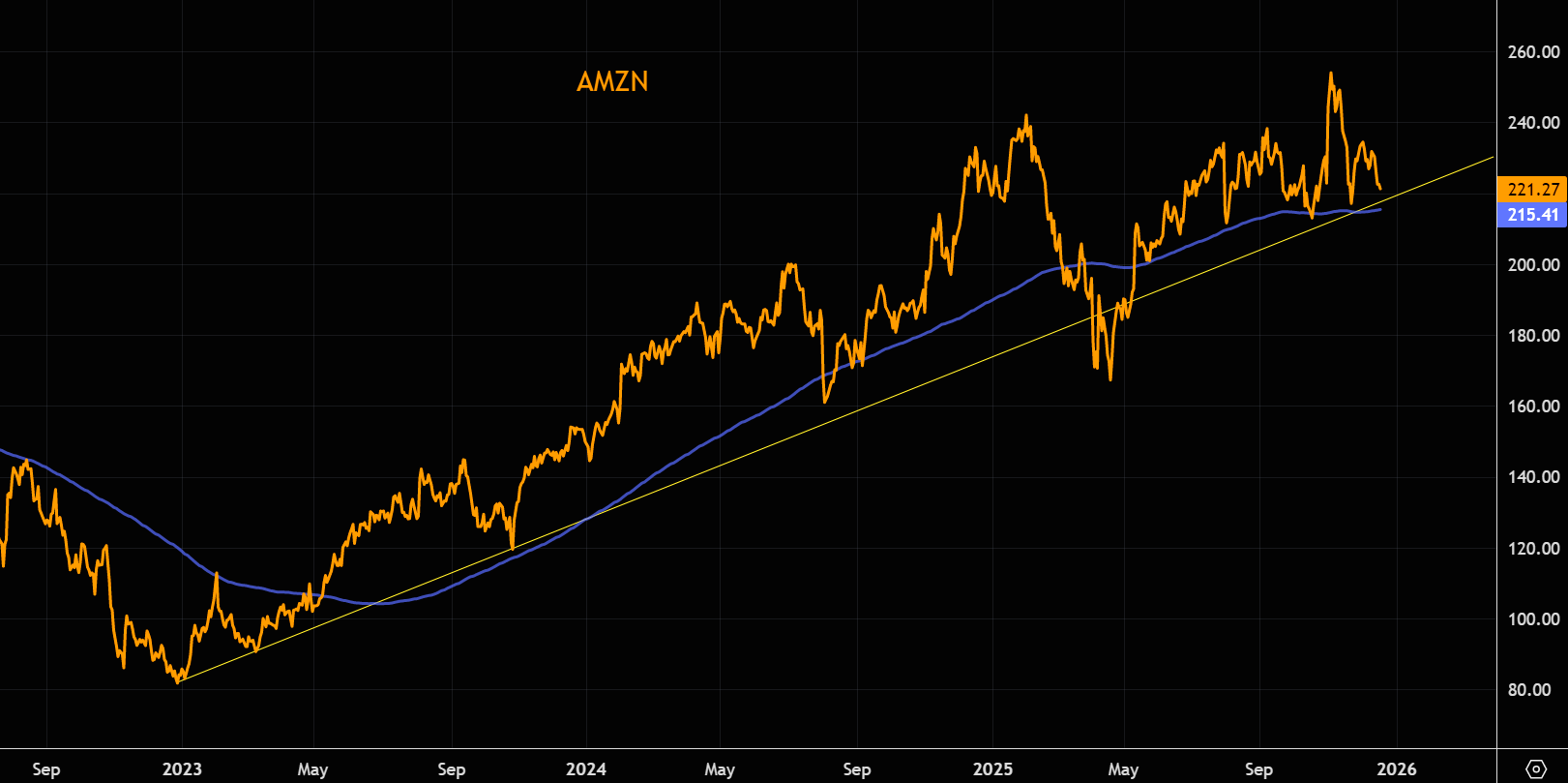 AMZN trades at December 2024 levels... note the longer term trend line and the 200 day are getting closer.