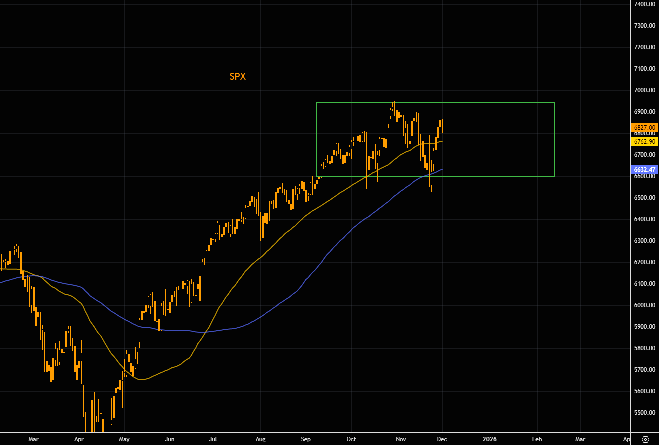 SPX trading inside the range that has been in place since around mid September. We bounced on the 100 day (range lows) and are trading above the 50 day, but we aren't getting excited, either way, until we see a proper break out move.