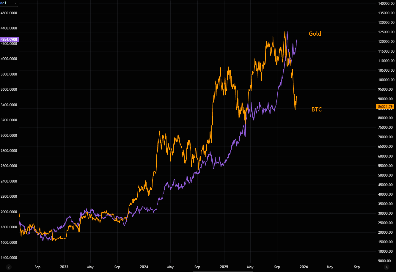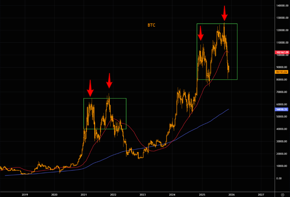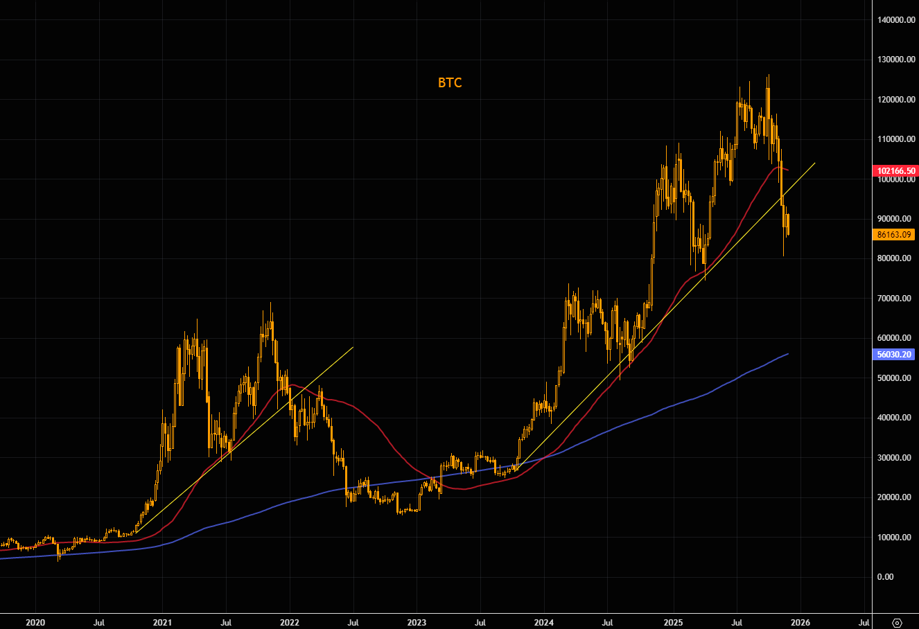 This looks uncomfortably similar to the 2021–2022 BTC pattern, a wide range, a soft double top, and then the air pocket. Once that range gave way back then, BTC dropped 50% and even knifed through the 200-week MA. Today that 200-week is near 56k. Chart two shows we’ve already cracked the big trend line. Full BTC note here.