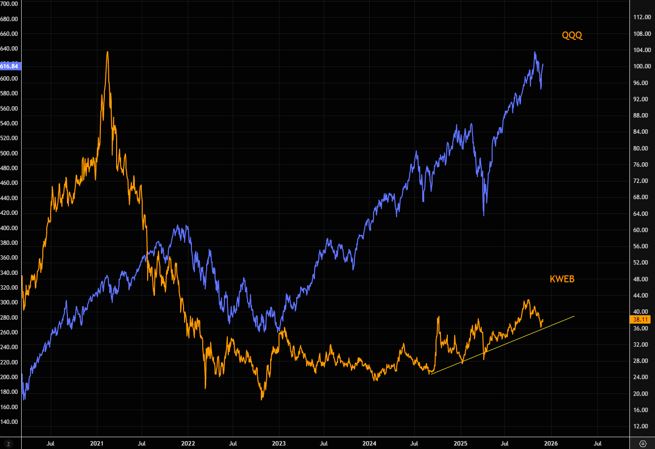 QQQ vs KWEB gap remains one of those massive gaps we like, not as a pairs necessarily, but KWEB as a laggard play. Full China tech note here.