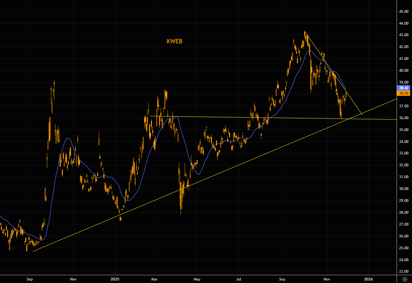 Very little talk about Chinese tech these days, but KWEB has managed rebounding over the past week (perfect bounce off the 200 day). Note we are back to the short term negative trend line and the 21 day. A close slightly higher, and this partly "forgotten tech" space could start squeezing even more.